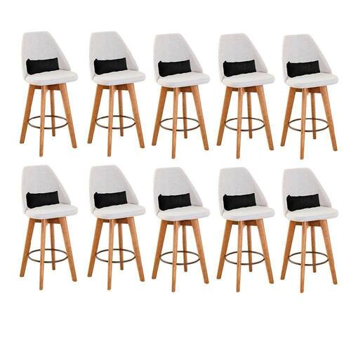 Kit 10 Banquetas Alta Maya Giratória Com Encosto Gourmet Linho Bege E Almofada Corino Preto - Gat Magazine Banqueta Maya Giratória - GAT MAGAZINE A Banqueta Maya possui assento e pés em madeira eucalipto com sistema giratório! Os pés contam com um reforço que proporciona um suporte de peso de até 120 Kgs.O assento é revestido com espuma D-23. Além de bonita e charmosa, vai trazer para seu ambiente elegância e proporcionará conforto para sua família e amigos nos momentos de lazer.