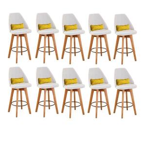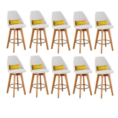 Kit 10 Banquetas Alta Maya Giratória Com Encosto Gourmet Linho Bege E Almofada Suede Amarelo - Gat Magazine Banqueta Maya Giratória - GAT MAGAZINE A Banqueta Maya possui assento e pés em madeira eucalipto com sistema giratório! Os pés contam com um reforço que proporciona um suporte de peso de até 120 Kgs.O assento é revestido com espuma D-23. Além de bonita e charmosa, vai trazer para seu ambiente elegância e proporcionará conforto para sua família e amigos nos momentos de lazer.