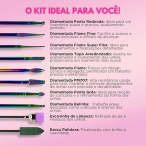 Contém: 01 - Broca Diamantada Bolinha 01 - Broca Diamantada Flame 01 - Broca Diamantada Flame Fina 01 - Broca Diamantada Flame Super Fina 01 - Broca Escovinha de Limpeza 01 - Broca Broca Polidora 01 - Broca Diamantada PM707 01 - Broca Diamantada Ponta Gota 01 - Broca Diamantada Ponta Redonda 01 - Broca Diamantada Topo Arredondado 01 - Caixa Organizadora com 10 Divisórias de Brocas. O kit ideal para manicures Perfeito para todos os atendimentos, composto por cortes de granulação diamantadas, com excelente durabilidade. Compatíveis com diversos modelos de lixadeiras e canetas. Indicado para profissionais que buscam precisão e eficácia em todas as etapas do alongamento, desde a remoção até o acabamento final. Cada broca foi projetada para uma função específica, garantindo versatilidade e resultado impecável: Diamantada Ponta Redonda: Indicada para remoção de gel e acrílico com segurança, evitando danos à cutícula. Diamantada Flame Fina: Ideal para refinamento e acabamento de unhas postiças, proporcionando precisão. Diamantada Flame Super Fina: Utilizada para detalhes delicados e acabamento suave em unhas artificiais. Diamantada Flame: Versátil, Utilizado para remoção e modelagem de alongamentos de unhas. Diamantada Ponta Gota: Indicada para limpeza de áreas próximas à cutícula e acabamento refinado. Diamantada Bolinha: Perfeita para abrir espaços e remover cutículas de forma segura. Broca Polidora: Utilizado para dar brilho e suavizar a superfície das unhas naturais ou artificiais. Escovinha de Limpeza: Remove resíduos de pó após o lixamento, mantendo as unhas limpas. Diamantada PM707: Broca resistente, ideal para remoção rápida de materiais como gel e acrílico. Diamantada Topo Arredondado: Proporciona lixamento seguro e eficaz, evitando lesões na cutícula. Características Principais: - 10 modelos de brocas; - Ideal para manicure, pedicure e podólogos; - Material de alta qualidade diamantada; - Acompanha caixa que organiza até 10 brocas com divisória; - Brocas furta-cor; - Escovinha de limpeza; - Broca polidora; - Kit completo que atende todas as técnicas. Boas Compras ; Marca: Arte Seducao