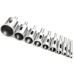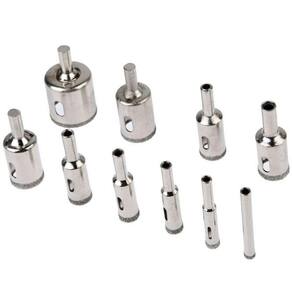 Kit com 10 brocas diamantadas de corte circular revestidas. Fura um círculo completo de vidros, mármores, granitos, espelhos, garrafas, pisos, azulejos, cerâmicas e madeiras.