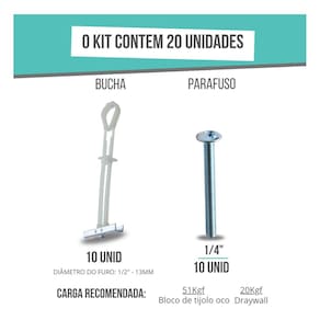 Ficha Técnica: Marca: SFOR Modelo: Bucha SFORBOLT Diâmetro Nominal: 1/4 polegadas Material: Nylon de alta resistência e Parafuso de metal Diâmetro do furo: 1/2 13 mm Comprimento do parafuso: 63 mm Diâmetro do parafuso: 1/4 x 2.1/2mm Espessura da base de fixação: 10 á 57 mm Carga Recomendada Drywall : 20 Kgf Carga Recomendada Bloco Concreto: 55 Kgf Quantidade: 10 Kits (20 pçs) Tipo de Fixação: Paredes ocas (Drywall e Gesso)