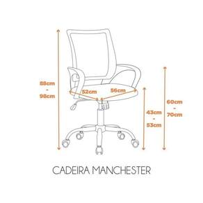 Perfeita para espaços compartilhados, a cadeira Manchester possui seu assento em espuma e base em tela junto a um apoio de lombar. Essa cadeira não possui o sistema relax, o que a torna mais simples, mas ainda assim muito confortável! Altura do Conjunto: 98 cm Ambiente: null Ambiente Principal: Escritório Cor: Preto Cor do Produto: Preto Informação Complementar: 10x Cadeira Dot Para Escritório Diretor com Rodízios Manchester Light Preto Largura: 56 cm Altura: 98 cm Peso: 9,8 kg Profundidade: 52 cm Necessita Montagem: Sim