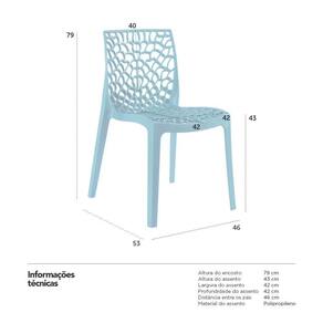 Cadeira modelo Gruvyer: Material: Polipropileno - Altura do encosto: 79 cm - Altura do assento: 43 cm - Largura do assento: 42 cm - Profundidade do assento: 42 cm - Distância entre os pés: 46 cm - Peso suportado: 130 kg - Produto certificado pelo INMETRO - Garantia: 3 meses.