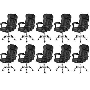 A cadeira Jacarta possui revestimento em PU, sistema relax com travamento, apoio de lombar e braços acolchoados. Base cromada giratória com rodízios PU que não danificam o piso. Cadeira imponente e muito confortável, em função do seu encosto alto. Altura do Conjunto: 107 cm Ambiente: null Ambiente Principal: Escritório Cor: Preto Informação Complementar: 10x Cadeira para Escritório Presidente Estofada Jacarta Preto Largura: 52 cm Altura: 107 cm Peso: 9 kg Profundidade: 78 cm Necessita Montagem: Sim
