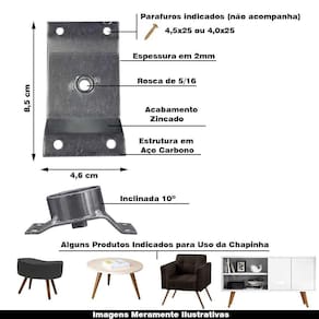 Chapinha em aço carbono é ideal para fixação de pés palitos em seus móveis, com uma elevada tornando a aparecia do móvel mais moderna.