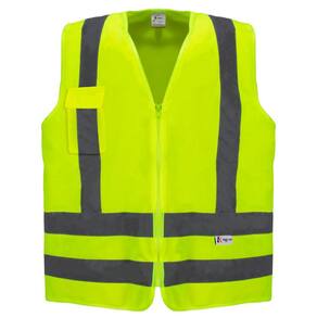 Colete de Sinalização de alta visibilidade, confeccionado em tecido 100% poliéster fluorescente com faixas reflexivas impermeáveis na parte frontal e costa, fechamento frontal em zíper. Performance de visibilidade superior para o indivíduo com o aumento da cobertura do tronco.