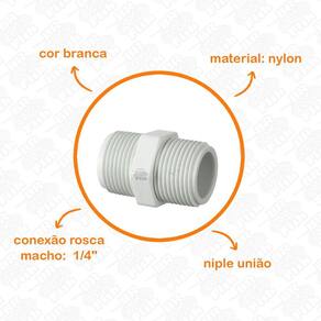 Produto altamente resistente a muitos componentes químico. Utilizado para facilitar a passagem de líquido entre a mangueira e o equipamento. Instalação A instalação é fácil, desenhado com a bucha e mangueira integrada na porca dispensa a necessidade de duas peças. Dados Técnicos Material: Nylon; Cor: Branco; Conexão rosca macho: 1/4