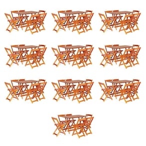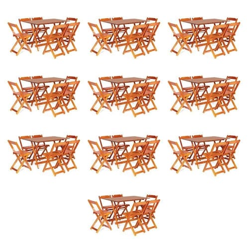 O jogo conta com dez mesas 1,20 x 70 cm e 60 cadeiras dobráveis, feitos em madeira maciça ( eucalipto) ,sendo que apenas o tampo da mesa e também onde pode se apoia os pés ( travessa ) é feito em CHAPA MDF ULTRA PLUS, garantindo melhor custo benefício, sem deixar a qualidade de lado. São peças que asseguram resistência, segurança muito conforto e bom preço.