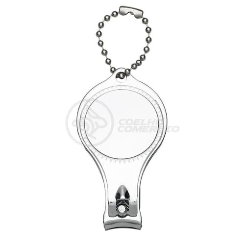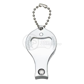 Cortador de unhas chaveiro de metal 3 em 1: abridor, cortador e lixa. Parte central circular ideal para gravações, detalhe de traços no contorno circular. Lado frontal com detalhes em relevo nas laterais e pequeno círculo acima do abridor. Para utilizar o cortador basta rotacionar a peça circular e levantá-la. Acompanha correntinha.