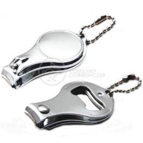 Cortador de unhas chaveiro de metal 3 em 1: abridor, cortador e lixa. Parte central circular ideal para gravações, detalhe de traços no contorno circular. Lado frontal com detalhes em relevo nas laterais e pequeno círculo acima do abridor. Para utilizar o cortador basta rotacionar a peça circular e levantá-la. Acompanha correntinha.