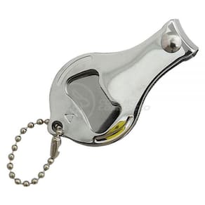 Cortador de unhas chaveiro de metal 3 em 1: abridor, cortador e lixa. Parte central circular ideal para gravações, detalhe de traços no contorno circular. Lado frontal com detalhes em relevo nas laterais e pequeno círculo acima do abridor. Para utilizar o cortador basta rotacionar a peça circular e levantá-la. Acompanha correntinha.