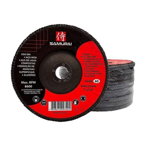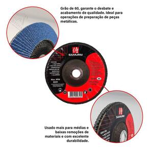 Descrição: O Disco de Lixa Flap Samurai combina desbaste e acabamento em um único produto, ideal para médias e baixas remoções. Versátil e eficiente, é perfeito para uso em lixadeiras e esmerilhadeiras angulares, proporcionando excelente desempenho em diversos materiais.