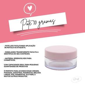 Pote de 10g, você terá espaço suficiente para acondicionar suas maquiagens favoritas, como sombras, batons, pigmentos, brilhos labiais, entre outros sejam em pó, cremosos ou líquidos.