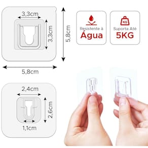 Kit 10 Ganchos Adesivo de Encaixe Transparente Multiuso Ganchos ideais para locais com superfície lisas como azulejos, pisos, madeiras envernizadas, vidro, inox e qualquer outra superfície apta a adesivação. O mais legal desse sistema de gancho é que a instalação é rápida, sem furos e sem sujeira, cole uma parte da superfície que deseja fixar e a outra no objeto que quer pendurar encaixe e pronto PRINCIPAIS DESTAQUES: - Kit com 10 pares- Suporta aproximadamente 5kg- Limpe bem as superfícies que deseja aplica superfícies lisas - Após aplicado aguarde aproximadamente 2 horas antes de colocar peso.- Resistente à água