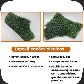 Dê um novo charme aos seus espaços com a Grama Sintética de Parede Feita em 100% polietileno de alta qualidade, ela traz um visual super natural, é leve, resistente e pode ser Utilizado tanto dentro quanto fora de casa. Fácil de instalar e quase sem manutenção, deixa qualquer ambiente mais bonito, moderno e cheio de vida. Ficha técnica: -medidas: L:40cm C:60cm -peso: apenas 250g, mais leve que modelos concorrentes -material: 100% polietileno, durável e resistente a umidade e raios Solares -acabamento compacto, espessura discreta , ideal para uso interno e externo -fácil instalação: encaixe simples e uso com abraçadeiras, ganchos, adesivos ou parafusos -baixa manutenção: Acabamento limpo e duravel 1.Qual é o material da grama sintética de parede A placa é fabricada em 100% polietileno de alta qualidade, garantindo durabilidade e resistência à umidade e aos raios UV. 2. Quais são as dimensões e o peso da placa Cada placa mede 40 60 cm e pesa apenas 250 g, muito mais leve que modelos concorrentes, que podem chegar a 3,5 kg por kit de 5 peças. 3.Onde posso instalar a grama sintética O acabamento compacto e discreto permite uso interno e externo, ideal para renovar paredes, jardins verticais e outros ambientes. 4.Como faço a instalação A instalação é simples: as placas podem ser fixadas com abraçadeiras, ganchos, adesivos ou parafusos, dependendo da superfície. 5.Preciso de manutenção constante Não A grama possui baixa manutenção, mantendo o acabamento limpo e durável por muito tempo. 6.O produto é resistente ao clima Sim, o material é resistente à umidade e aos raios UV, garantindo longa durabilidade mesmo em ambientes externos.