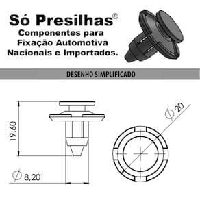 Especificação Técnica: Grampo Fabricado em Plástico de Alta Resistência Branco C/ Anel Preto Emborrachado Alta Durabilidade Fácil Instalação Ótimo Acabamento Encaixe Perfeito Produto Similar ao da Montadora Medidas: Corpo 19,60mm / Cabeça 20mm / Furo 8,20mm O Friso/Moldura Porta Malas não acompanham o kit de fixação!