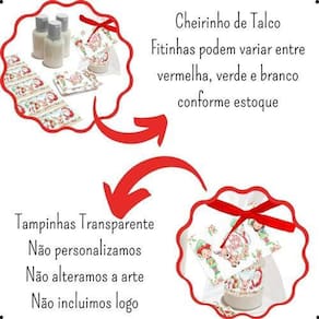 Especificações técnicas: - Quantidade: 10 lembrancinhas - Frasco: Transparente, capacidade de 30 ml - Tampas: Transparentes - Aroma: Talco - Etiquetas: 10 unidades - Tags com furo: 10 unidades - Fitas de cetim: 10 unidades - Saquinhos de celofane transparente: 10 unidades