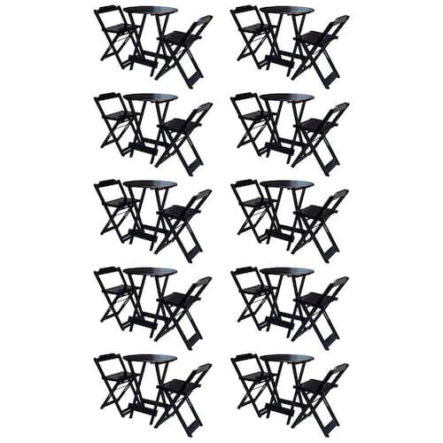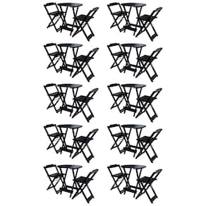 Kit 10 Jogos De Mesa Bistrô De Madeira Com 2 Cadeiras Dobravel Ideal Para Bar E Restaurante Preto é ideal para bares, restaurantes, estabelecimentos, áreas de lazer e tambem para sua casa. Feito em madeira maciça, tornando resistentes e duráveis. Seu design permite que seja encaixado em qualquer ambiente, trazendo um toque a mais para seu estabelecimento. Além de sua durabilidade, o que lhe trará conforto para servir seus clientes. Por ser dobrável torna-se mais fácil guardar, manusear e limpar o produto. Atenção: EVITE USAR PRODUTOS ABRASIVOS E QUíMICOS PARA LIMPEZA DO PRODUTO, aconselha-se o uso de pano umedecido para melhor conservação; mantenha o produto fora de chuva e sol constantes. OBS: MDF ULTRA MESA Cor: Preto Modelo: Bistrô Dobravel Dimensões: Altura 99cm | Largura 55cm | Profundidade 55cm CADEIRA Cor: Preto Modelo: Bistrô Dobravel Dimensões: Altura 100cm | Largura 38cm | Profundidade 37cm