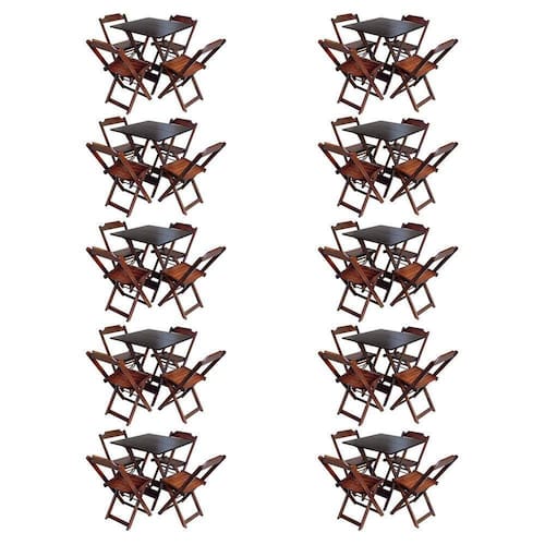 Kit 10 Jogos De Mesa Com 4 Cadeiras De Madeira Dobravel 70x70 Ideal Para Bar E Restaurante - Imbuiaé ideal para bares, restaurantes, estabelecimentos, áreas de lazer e tambem para sua casa. Feito em madeira maciça, tornando resistentes e duráveis. Seu design permite que seja encaixado em qualquer ambiente, trazendo um toque a mais para seu estabelecimento. Além de sua durabilidade, o que lhe trará conforto para servir seus clientes. Por ser dobrável torna-se mais fácil guardar, manusear e limpar o produto.Atenção: EVITE USAR PRODUTOS ABRASIVOS E QUíMICOS PARA LIMPEZA DO PRODUTO, aconselha-se o uso de pano umedecido para melhor conservação; mantenha o produto fora de chuva e sol constantes MESA Cor: Imbuia Modelo: Dobravel Dimensões: Altura 76cm | Largura 70cm | Profundidade 70cmCADEIRA Cor: Imbuia Modelo: Dobravel Dimensões: Altura 80cm | Largura 45cm | Profundidade 42cmKit 10 Jogos de Mesa com 4 Cadeiras de Madeira Dobravel 70x70 Ideal para Bar e Restaurante - Imbuia