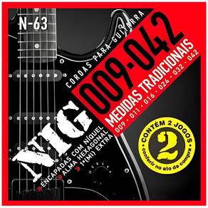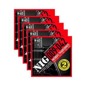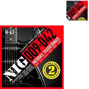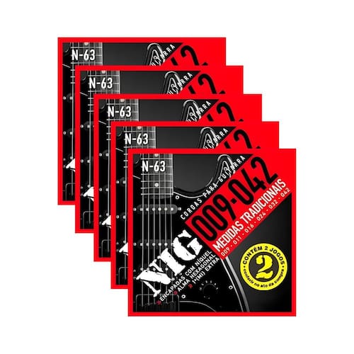 Kit 10 Jogos Encordoamento Guitarra Nig N-63 .009 - 042” + BrindeAs cordas Nig proporcionam o timbre e brilho que você procura para o seu violãoEncapadas com níquel.Alma hexagonal..Especificações:Medidas: 029”/.044”Alta TensãoAcabamento Com BolinhaAcabamento: ClássicoCalibres e Tensões Internacionais;Mais som, brilho e durabilidade;Alta tensão nas cordas;41º Corda extra em todos os jogos.Espessura 009/ 011/ 016/ 024/ 032/ 042. Itens Inclusos:5 Embalagens Econômicas contendo 10 jogos de cordas completos10 Cordas (1º Mi Extra)10 Palhetas*Imagens Ilustrativas*