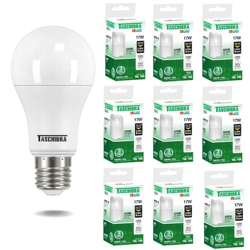 Kit 10 Lâmpadas Led Bulbo TKL 17W Taschibra E27 Bivolt 4000K - Neutro Suave - Características Gerais do Produto: Dimensões AxLxP cm : 12 x 5,5 x 5,5 Produzido em: Plástico, Alumínio, Placa de Circuito Impresso e Componentes Eletrônicos Voltagem: Autovolt tanto em 110v como em 220v Cor Acabamento: Branco Potência: 17W Fluxo Luminoso: 1.507 Lumens Eficiência Luminosa: 89 Lm/W Ângulo de Abertura: 120 Para Uso em Soquete: E27 Formato: Bulbo : 3 anos junto ao fabricante Aplicação: Sobrepor Vida Útil: 25.000 horas Cor da Luz: 6500K Frio - 4000K Neutro - 3000K Quente Ajuste de intensidade dimerizar : Não Acompanha o produto: 10 Lâmpadas LED : 3 anos junto ao fabricante Marca: Não Informado