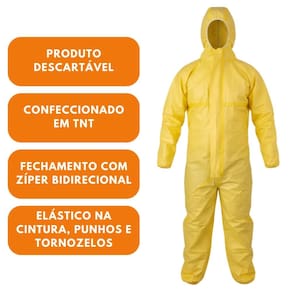 Macacão de segurança confeccionado em tecido não tecido (TNT) de polipropileno com uma camada laminada de polietileno, capuz de três peças com elástico, fechamento frontal com zíper bidirecional e aba protetora, elástico no punho para ajuste no dedo polegar, costuras seladas, elástico na cintura, punhos e tornozelos.