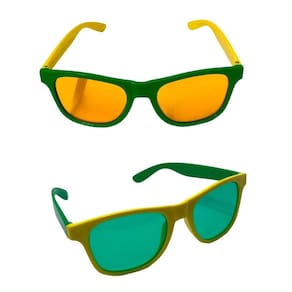 Óculos festa torcedor para o brasil óculos modelo cores do brasil confeccionado em material plástico - material muito leve e confortável de usar- use em festas e bares como óculos fantasia e torcedor do brasil- vem torcer com a gente na de 2022 - 10 unidade de óculos verde e amarelo -tamanho : 13. 5 cm de comprimento x 14 cm de largura- validade indeterminada.