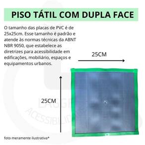 As placas de piso táteis são fabricadas em PVC, um material plástico durável e resistente ao desgaste. O PVC é leve e fácil de manipular, tornando a instalação mais conveniente. Cada placa segue as normas técnicas da ABNT NBR 9050 para acessibilidade em edificações e espaços públicos, medindo 25x25cm.