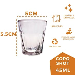 Um copo shot transparente de 45mL é um pequeno recipiente utilizado para servir bebidas em quantidades controladas. Com um design simples e elegante, o copo é feito de vidro transparente e possui capacidade para uma dose única de bebida destilada ou licor. Ideal para quem gosta de desfrutar de uma bebida forte em pequenas doses, o copo shot é perfeito para ocasiões sociais ou para momentos de relaxamento solitário.
