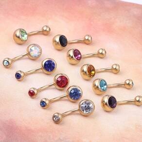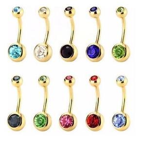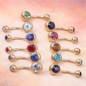 Piercing de umbigo em aço cirúrgico banhado a ouro. Marca: love bijoux Modelo: dourado 2 pedras Unidades por embalagem: 10 Espessura: 16 mm Materiais: aço Tipo de piercing: umbigo Zona de aplicacao: umbigo Marca: Decastro Ean: 7891566668802