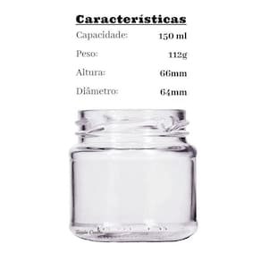 Características: - capacidade: 150 ml - altura: 6,6 cm. - diâmetro: 6,4 cm - peso: 112g - gargalo: 63mm - tampa: 63mm de 4 garras. - denominação: mini belém