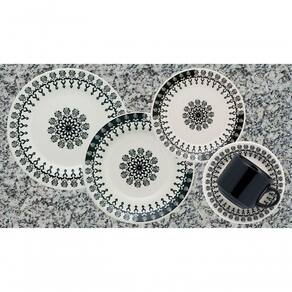 A cor preta é básica e neutra, um verdadeiro curinga na hora de montar a mesa. Nessa louça, colocamos a cor preta numa estampa mais alegre e jovial, perfeita para quem prefere um formato de pratos tradicional com uma decoração mais alegre. A xícara preta, sem decoração, cria uma linda composição com as demais peças.