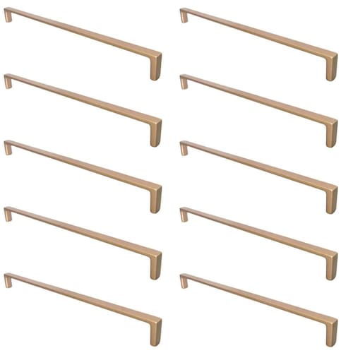 Garantia: 3 anos / Peso total: 940g / Cor predominante: dourado / Ref: 7794463803874 Dimensões de cada: 26,2cm (C) x 1cm (L) x 2,5cm (A); Conteúdo: 10 puxadores e 20 parafusos para instalação; Material: zamac; Cuidados: não lavar com materiais abrasivos.