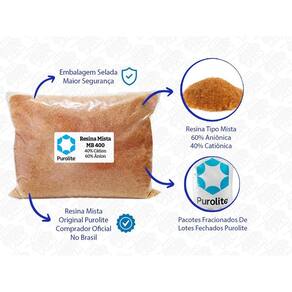 Resina mista MB400MB 400 tem 40% Catiônica Forte e 60% Aniônica Forte - A água produzida terá condutividade média por volta de 0,1 S/cm para a maior parte da campanha, que pode ser mais extensa dependendo da qualidade final da água requerida. Produção de água desmineralizada com alta pureza, livre de sílica e Alta capacidade de produção .Pode ser usada em qualquer processo que exija água deionizada ou desmineralizada.Ideal para uso em:Trocas e reposições de água para aquários.Aparelhos de Auto Clave.Produção de cosméticos e produtos de limpezaCromação ou Metalização de peçasFabricação do Arla 32Arrefecimento de motoresLavagem de cartuchos para impressoras, etc.Contem:10x Resina MB 400 - Kit com 5000 gramas