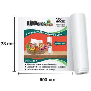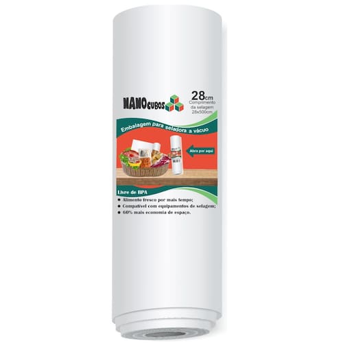 Kit 10 Rolos Nanocubos 28x500 Sacos Ranhura Seladora a vácuo Embalagens 10 rolos NANOCUBOS 28 cm X 500 cm para seladoras a vácuo. Embalar produtos a vácuo é a melhor forma de mantê-los sempre protegidos por muito mais tempo. Ao embalar alimentos, a validade deles é completamente estendida, pois eles não terão nenhum contato com o ar e serão pouco afetados pela ação do tempo. Você pode embalar tanto alimentos crus como alimentos já preparados para serem consumidos em outro momento. Você economiza muito dinheiro e evita o desperdício Os sacos para vácuo Nanocubos são produzidos com alta tecnologia em Nylon Poli seguindo padrões de qualidade internacional. Possuem 12 micras, 3 barreiras de proteção, sem presença de BPA Não tóxicos e funcionam com equipamentos de embalagens a vácuo. Além de alimentos, é possível utilizá-lo com objetos pessoais, documentos ou utensílios, conservando-os como novos por muito tempo e aumentando sua vida útil. Características do produto: - Aparência: Transparente com ranhuras; - Forma disponível: Rolos, é possível montar SACOS do tamanho que quiser; - Quanto ao uso: Reciclável pode utilizar várias vezes seguidas; - Iniciação ao rasgo: Difícil; - Propagação ao rasgo: Difícil; - Temperatura máxima de uso: 120 C; - Resistência a ácidos: Excelente mantendo o cheiro do alimento; - Resistência a óleos e gorduras: Excelente; - Segurança alimentar: Conserva o alimento. Conteúdo da Caixa 10- Rolos 28 cm X 500 cm. Políticas da loja: - : contra defeitos de fabricação, 90 dias; - Prazo de envio: imediato após a confirmação do pagamento; - Cancelamento: Realizamos a devolução total do dinheiro; Qualquer dúvida estamos à disposição Ean: 7797495840565