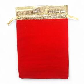Tamanho: 18 cm x 13 cm Cores: Vermelho com detalhes dourados Material: Veludo de alta qualidade com cordão dourado para fechamento fácil e seguro