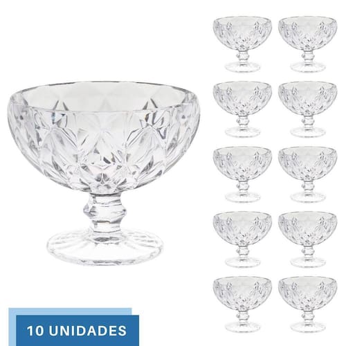 Taça de Sobremesa de 335ml Diamante Com sua capacidade de 335ml, essas taças são ideais para servir porções generosas de sobremesas como sorvetes, mousses, pudins e outras delícias. Além disso, por serem transparentes, permitem que você aprecie a beleza das camadas e texturas de suas sobremesas, tornando a experiência de saboreá-las ainda mais agradável. Estas taças são fáceis de limpar e podem ser utilizadas em diversas ocasiões, proporcionando um toque especial e elegante à sua mesa.