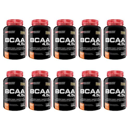 Kit 10 x Bcaa 4,5 100gr - Bodybuilders BCAA 4.5. BODYBUILDERS BCAA 4.5 BODYBUILDERS é uma combinação de três aminoácidos essenciais para quem pratica musculação, crossfit, ciclismo, lutas, entre outros esportes. Aminoácidos esses que são responsáveis por 35% da nossa massa muscular e não são sintetizados pelo corpo não são produzidos no organismo , por isso devem ser obtidos atráves de alimentação ou suplementação, são eles: leucina, isoleucina e valina. Por ser um Bcaa em pó, BCAA 4.5 Bodybuilders além de ter uma rápida absorção conta com um grau de pureza muito elevado, pois não precisa de excipientes e seu teor de aminoácidos é maior por grama do produto. BCAA 4.5 antes ou depois do treino Tomar BCAA 4.5 Bodybuilders antes do treino ajudará a liberar mais energia reduzindo fadiga e fazendo com que seu treino seja mais proveitoso. A contribuição mais importante do BCAA antes do treino é o equilibrio que ele promove entre os níveis de cortisol hormônio que promove catabolismo, dificultando o ganho de massa muscular . Logo após o treino seus músculos estão fadigados e desesperados por nutrientes, pois suas reservas foram todas esgotadas durante o treino e suas fibras musculares estão lesionadas. É nesse momento que se abre a janela de absorção período em que a entrada de nutrientes nos tecidos musculares é muito maior que o habitual. Consumindo BCAA 4.5 Bodybuilders nesse momento sua absorção será facilitada e com a disposição de aminoácidos fornecida inciará a sintese proteica e recuperação muscular, executando esse processo diariamente fará com que o aumento de massa muscular seja rápido e significativo. A conclusão que chegamos é que o BCAA 4.5 é um suplemento benéfico para o seu organismo e objetivos em qualquer momento. Como tomar BCAA 4.5 Sugerimos o consumo de 6 a 10g antes da atividade física e a mesma quantidade logo após o treino. Benefícios BCAA 4.5: - Aumenta massa muscular- Rápida absorção- Função anabólica e anticatabólica - Melhora a recuperação muscular- Reduz a fadiga- Auxlia no emagrecimentoIsento de registro - RCD 27/2010 ANVISA .