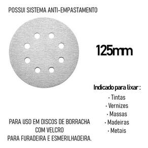 O disco de lixa é ideal para se usar com discos de borracha, furadeira e esmerilhadeira. Produzido em lixa abrasiva com pluma é indicado para lixar massa, tintas, vernizes, metais e madeira. CARACTERÍSTICAS TÉCNICAS:Material: Resina, óxido de alumínio, papel e plumaMedidas: 125mm (5”)Quantidade de furos: 8 Limite máxima: 12220rpm, 80m/sGrão: 100Quantidade: 100 unidadesMarca: StarferRef.: 4003489
