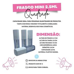 Altura do frasco: 4.1 CM Altura da tampa: 3.3 cm Altura fechado: 7.5 cm Circunferência: 6.8 cm Diâmetro: 1,8 cm Capacidade: 2,5 ml Material: Plástico Sangel