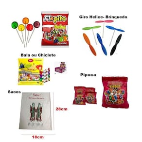 contém: 2 sacos de pipoca doce com 50 unidades 4 pacotes de pirulito com 400 gramas 4 pacotes de chiclete ou bala com 100 unidades 2 pacotes de paçoca com 50 unidades 4 pacotes de brinquedo giro helice com 25 unidades 1 pacote de saquinho para montar contendo 100 unidades