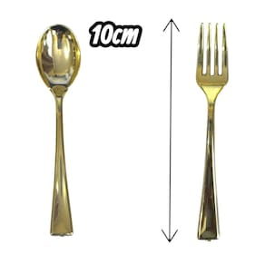 Transforme suas ocasiões especiais com o nosso exclusivo Kit de Mini Colher e Garfo Dourados de 10cm Feitos em acrílico rígido de alta qualidade, ambos os utensílios oferecem brilho e elegância para suas festas, eventos e fotos.