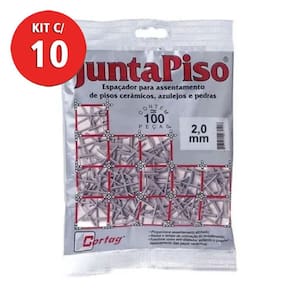 ** KIT EXCLUSIVO COM 1000 UNIDADES **Espaçador juntapiso 2mm CortagConteúdo: 10 Pacote com 100 unidades.Aplicação/ Características: Proporciona assentamento alinhado; Reduz o tempo de colocação do revestimento. Funciona como anti-dilatador, evitando o possível deslocamento das peças cerâmicas.Material/ Composição: Polipropileno.Vantagens:- Reduz o tempo de colocação do revestimento;- Funciona como anti-dilatador, evitando o possível deslocamento das peças cerâmicas.Cor: Cinza.Tamanho: 2 mm.Comprimento: 28 mm.Largura: 2 mm.Altura: 3 mm.Marca: CortagCódigo: KIT-51746-10