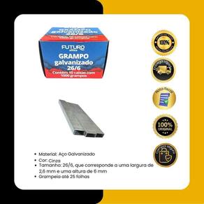 Kit contendo 10 caixas com 10mil em cada Grampo Galvanizado 26/6 Futuro O Grampo Galvanizado 26/6 - Futuro é uma ótima opção para quem precisa de um grampo de qualidade e durável. O grampo é feito de aço galvanizado, o que o torna resistente à corrosão e ao desgaste. Validade: Indeterminada Marca: Futuro Dimensões cm : 4.00 x 3.00 x 11.00 A x L x P Organização e Durabilidade com Grampo Galvanizado 26/6 - Futuro Sua Solução de Escritório Perfeita Resistência para o Dia a Dia Feitos de aço galvanizado, esses grampos são extremamente resistentes, resistentes à corrosão e ao desgaste. Ideal para quem valoriza produtos de longa duração e quer garantir que seus documentos estejam sempre bem presos. Praticidade e Versatilidade As dimensões compactas Confiança e Segurança Com a marca Futuro, você tem a de adquirir um produto desenvolvido para atender às suas expectativas de qualidade e desempenho. Garanta o Seu Agora Não perca a oportunidade de otimizar seu ambiente de trabalho. Adquira os grampos galvanizados 26/6 e experimente a diferença de um produto confiável e eficiente na organização de seus documentos. Marca: Não Informado