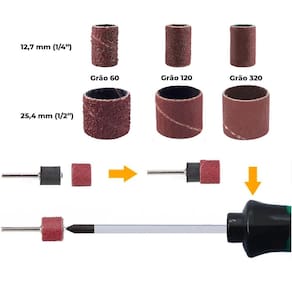 Jogo de tubo cinta de lixa para micro retíficas gramaturas 60, 120 e 320 com haste profissional kit com 104 peças O jogo de tubo cinta de lixa para micro retíficas é indicado para , e elevará a qualidade e eficiência do seu trabalho. Este kit exclusivo conta com 104 peças de alta performance, proporcionando versatilidade e precisão em suas tarefas de lixamento Itens inclusos - 18 tubos de lixa 12,7mm grão 60 1/4 pol. - 18 tubos de lixa 25,4mm grão 60 1/2 pol. - 16 tubos de lixa 12,7mm grão 120 1/4 pol. - 16 tubos de lixa 25,4mm grão 120 1/2 pol. - 16 tubos de lixa 12,7mm grão 320 1/4 pol. - 16 tubos de lixa 25,4mm grão 320 1/2 pol. - 2 hastes para tubos de lixa 12,7mm 1/4 pol. - 2 hastes para tubos de lixa 25,4mm 1/2 pol. - 1 estojo plástico Especificações - marca: dremax - modelo: kal-104 - encaixe das hastes: 3mm - compatível com todas as marcas de micro retífica do mercado - aplicações indicador para moldar, aparar, dar forma, moagem fina, polimento. Acabamento, remoção de material, alisamento, remoção de ferrugem nos metais, etc. - materiais indicados: materiais mais macios como madeira dura, madeira macia, plástico, fibra de vidro, alumínio, cerâmicas, borracha, unhas de animais, unhas artificiais, pedras e muito mais. - velocidade indicada: :: de 10.000 a 35.000rpm para madeiras, cerâmicas e pedras :: 35.000rpm para metais :: de 10.000 a 20.000rpm para plástico - : 90 dias contra defeitos de fabricação Diferenciais Gramaturas variadas: este conjunto abrangente inclui cintas de lixa nas gramaturas 60, 120 e 320, atendendo às diferentes necessidades de acabamento e desbaste. Essa variedade permite que você escolha a abrasividade adequada para cada etapa do seu projeto. - compatibilidade com todas as micro retíficas: desenvolvido especialmente para micro retíficas, o jogo de tubo cinta de lixa se encaixa perfeitamente, garantindo estabilidade e segurança durante o uso. Isso significa menos esforço e mais precisão em suas aplicações. Qualidade premium: todas as peças são fabricadas com materiais de alta qualidade, garantindo resistência ao desgaste e resultados excepcionais. O jogo de tubo cinta de lixa para micro retíficas é projetado para profissionais exigentes que buscam ferramentas confiáveis e eficientes.