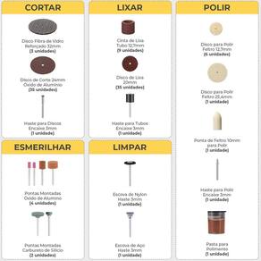 Itens Inclusos: - 3 Discos de Corte 32mm Reforçados - 35 Discos De Corte 24mm - 35 Discos De Lixa 20mm - 9 Tubos De Lixa 12,7mm - 1 Disco de Polimento 25,4mm - 6 Discos de Polimento 12,7mm - 1 Ponta de Feltro 10mm - 1 Ponta Montada 10mm Carboneto de Silício verde - 1 Ponta Montada 20mm Carboneto de Silício verde - 1 Ponta Montada 9,5mm Óxido de Alumínio laranja - 1 Ponta Montada 14,3mm Óxido de Alumínio laranja - 1 Ponta Montada 6mm Óxido de Alumínio rosa - 1 Ponta Montada 6mm Arredondada Óxido de Alumínio rosa - 1 Escova Copo 12mm Aço - 1 Escova 20mm Nylon - 1 Suporte para Tubo de Lixa 12,7mm - 1 Suporte para Discos de Corte e Lixa - 1 Suporte para Disco de Feltro - 1 Pasta de Polimento - 1 Pedra para Afiar - 2 Potes Plásticos Marca: Dremax