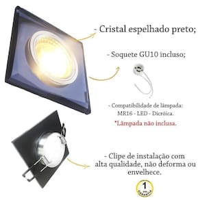 Descrição do spot: - Material: Cristal espelhado preto e alumínio Dimensões: Comprimento: 9 cm Largura: 9 cm Altura: 0,8 cm Recorte no teto : 6,5 cm