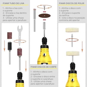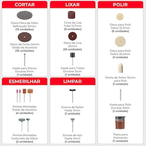 Kit com 115 Acessórios para Micro Retífica Completo Dremax. Com 105 peças para lixar, polir, cortar, esmerilhar, limpar, gravar, desbastar, furar, etc. - Marca: Dremax - Kit completo com 115 peças para lixar, polir, esmerilhar, limpar, gravar, desbastar e furar - Hastes de 3mm padrão de todas as micro retíficas - Uso em micro retíficas de qualquer marca - Peso bruto: 162 gramas - : 90 dias contra defeitos de fabricação Itens Inclusos: - 13 Discos de Corte 32mm Reforçados - 35 Discos De Corte 24mm - 35 Discos De Lixa 20mm - 9 Tubos De Lixa 12,7mm - 1 Disco de Polimento 25,4mm - 6 Discos de Polimento 12,7mm - 1 Ponta de Feltro 10mm - 1 Ponta Montada 10mm Carboneto de Silício verde - 1 Ponta Montada 20mm Carboneto de Silício verde - 1 Ponta Montada 9,5mm Óxido de Alumínio laranja - 1 Ponta Montada 14,3mm Óxido de Alumínio laranja - 1 Ponta Montada 6mm Óxido de Alumínio rosa - 1 Ponta Montada 6mm Arredondada Óxido de Alumínio rosa - 1 Escova Copo 12mm Aço - 1 Escova 20mm Nylon - 1 Suporte para Tubo de Lixa 12,7mm - 1 Suporte para Discos de Corte e Lixa - 1 Suporte para Disco de Feltro - 1 Pasta de Polimento - 1 Pedra para Afiar - 2 Potes Plásticos Marca: Não Informado Ean: 7734625998246