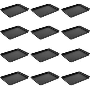 Garantia: 90 dias / Peso total: 2,544kg / Cor predominante: preto / Referência: 7798138254015; Dimensões de cada: 32,5cm (C) x 23,5cm (L) x 2,5cm (A); Cuidados: não limpar com materiais abrasivos. Vai ao micro-ondas e freezer. Vai a lava louças; Conteúdo: 12 bandejas para servir. Material: plástico polipropileno.