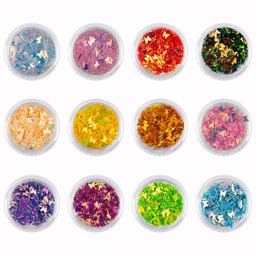 Inclui 12 potinhos de lindos enfeites em formato de borboletas coloridas. Produto indicado para decoração de unhas naturais e artificiais, slime, maquiagem, chinelo, arte do corpo, capa de celular, etc. Cor: Colorido